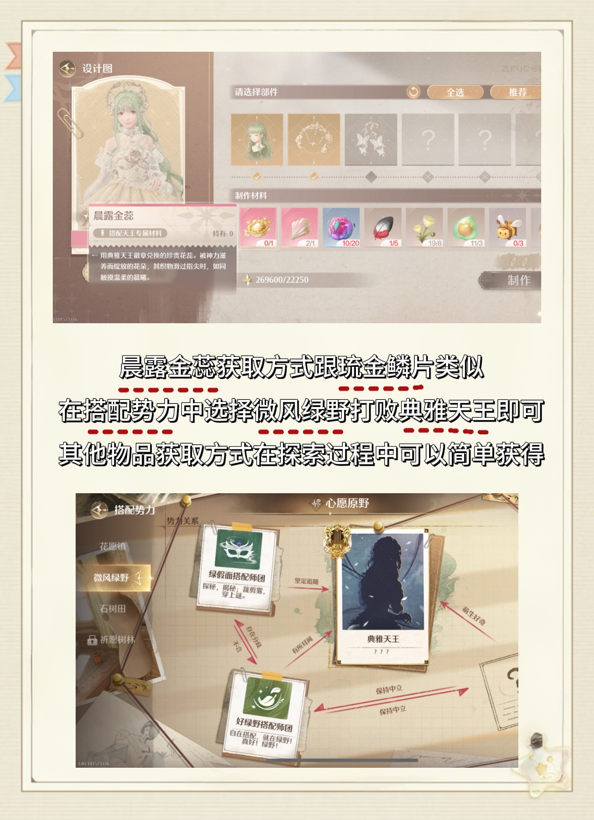 晨露金蕊获取方式跟琉金鳞片类似,在搭配势力中选择微风绿野打败典雅天王即可