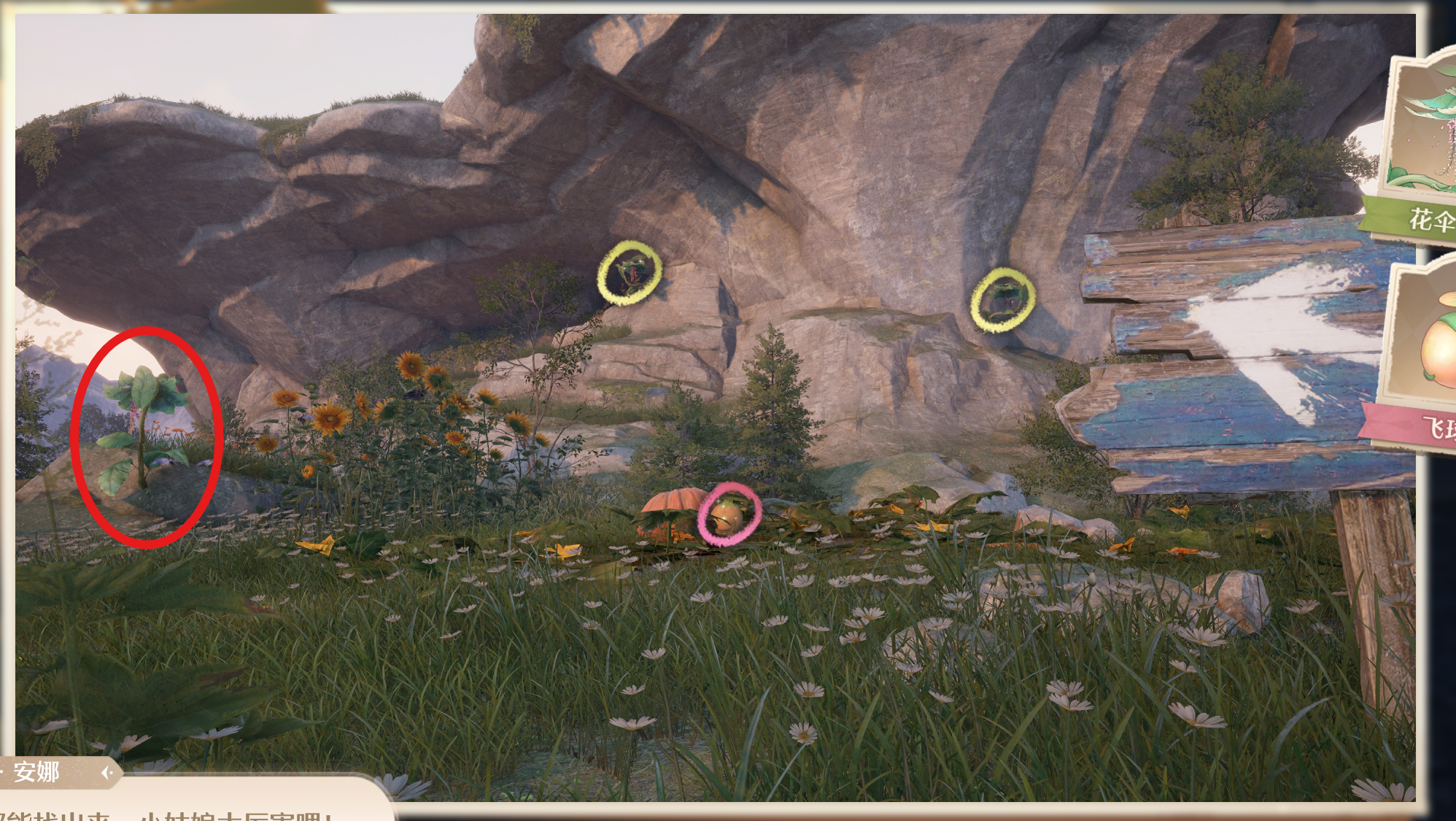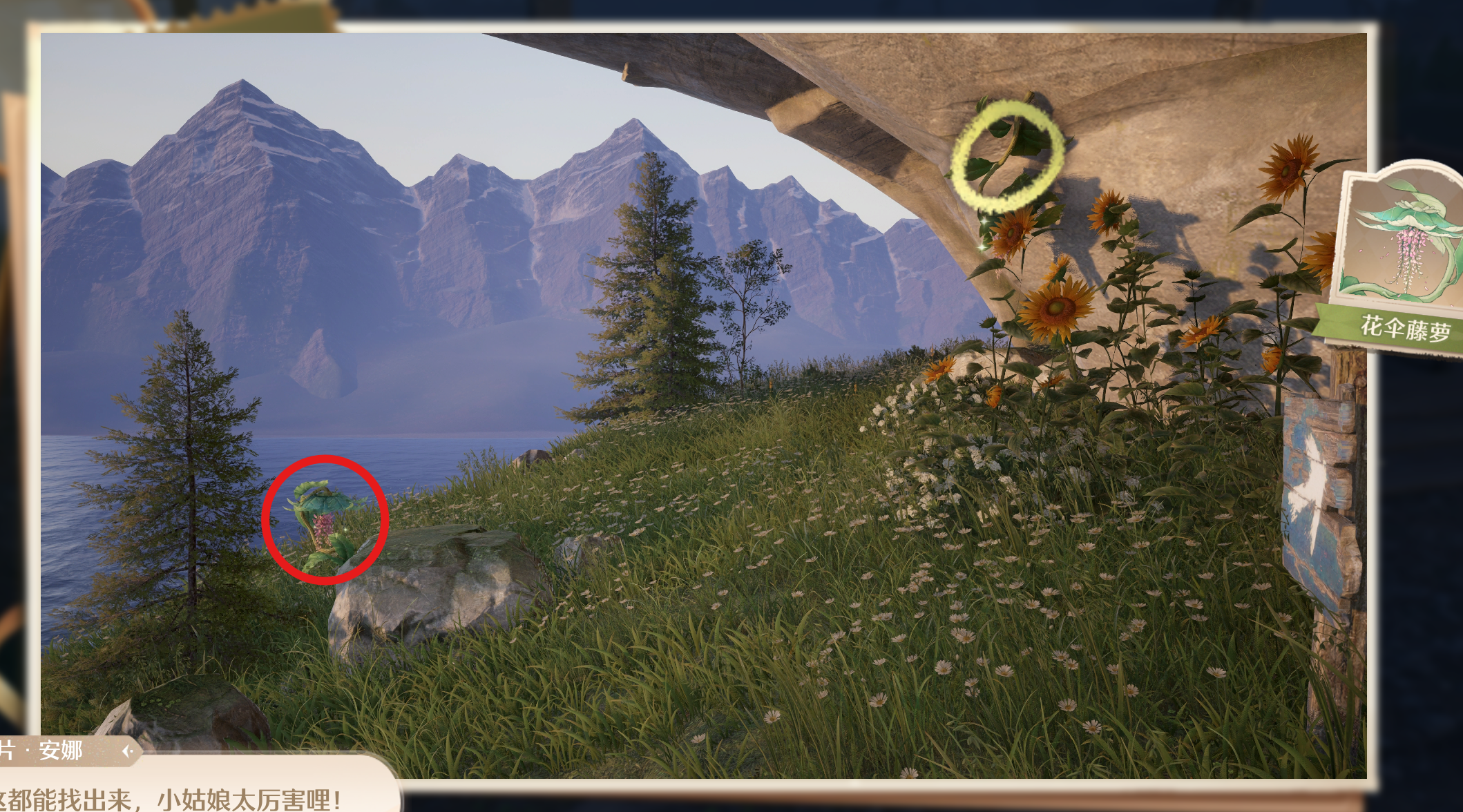 找到安娜npc,在她给出的照片中找到飞球果和花伞藤萝,具体位置如图所示: