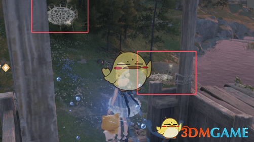 2、抵达后需要借助图中方框位置的两个蹦床,跳跃到哨塔之上。