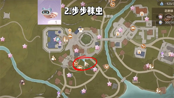 在花园镇城区左边的这个位置,换上捕虫套装慢慢走过去抓捕,这个虫子很机敏所以要慢慢的