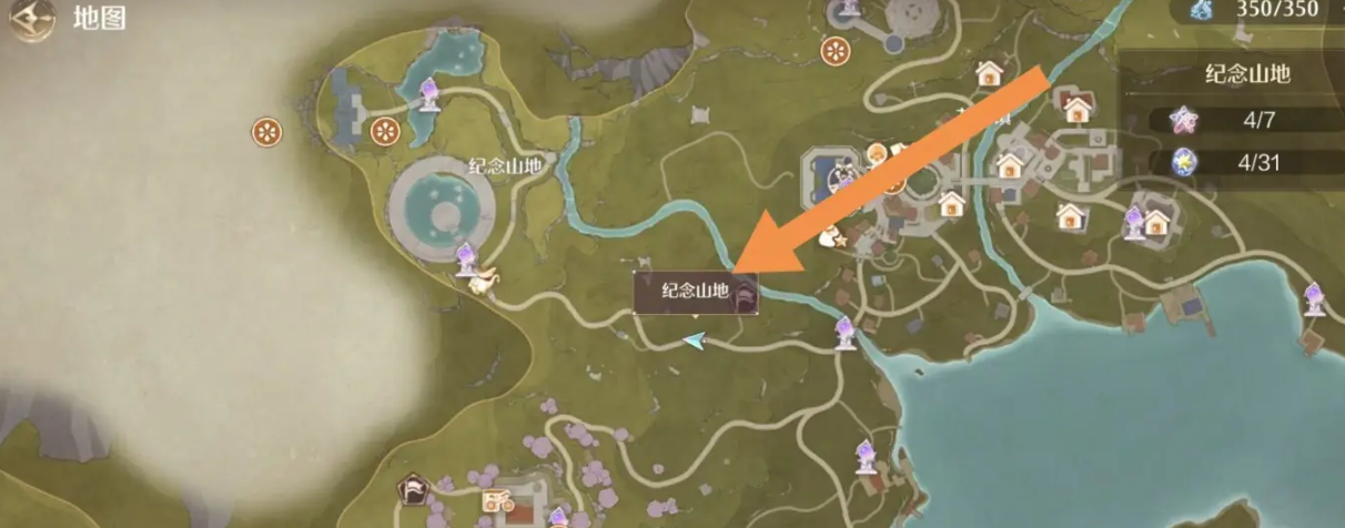 1、打开地图,来到纪念山地箭头位置处,
