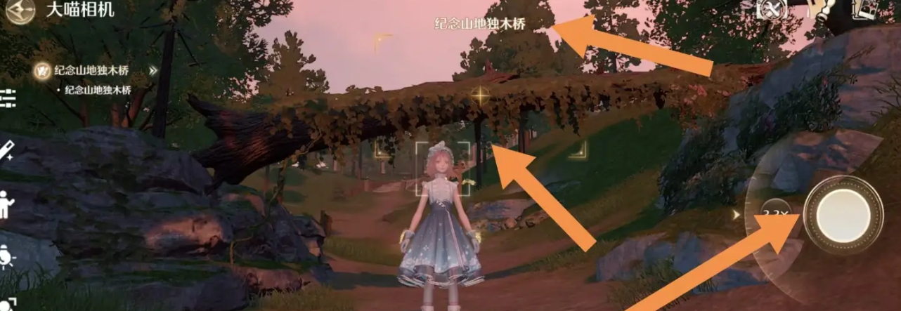 2、来到独木桥前,然后进入拍照页面,待纪念山地独木桥下显示十字光标,点击【拍照图标】