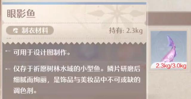 无限暖暖眼影鱼是制衣材料,可用于设计图制作。仅存于祈愿树林水域的小型鱼。鳞片研磨后细腻而绚丽,是饰品与美妆品中不可或缺的调色剂。下面给大家带来了《无限暖暖》眼影鱼钓鱼方法位置,不清楚眼影鱼在哪钓的一起来看看吧!