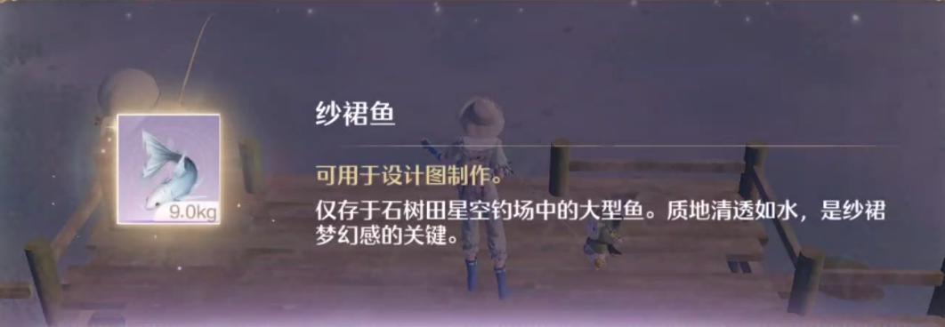 纱裙鱼可用于设计图制作。仅存于石树田星空钓场中的大型鱼。质地清透如水,是纱裙梦幻感的关键。那么无限暖暖纱裙鱼在哪里钓呢?下面是小编给大家带来的《无限暖暖》纱裙鱼钓鱼位置,感兴趣的小伙伴们一起来看看吧。