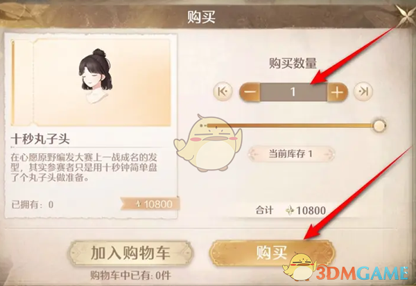 4、选择购买数量后,然后消耗10800噗灵进行购买就可以获得十秒丸子头发型了。