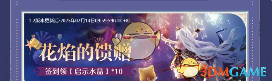 1、花焰的馈赠:1.2版本更新后至2025年2月14日,签到可领取启示水晶×10。