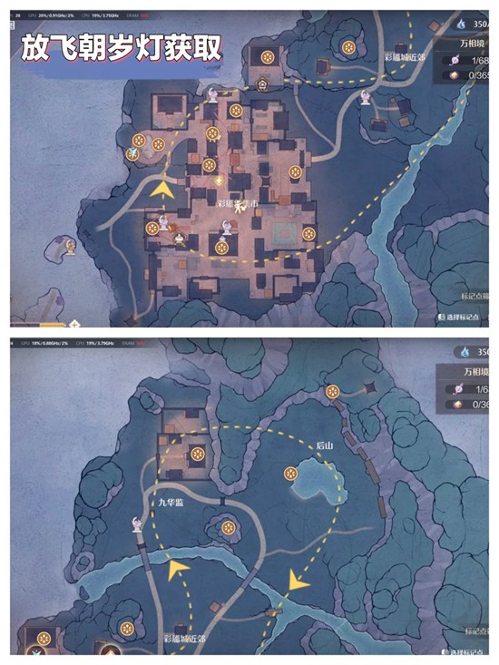 获取方式一:放飞朝岁灯,已标注每个灯笼的位置,共16个。每个点亮后可获取5钻石和500个万相通宝。