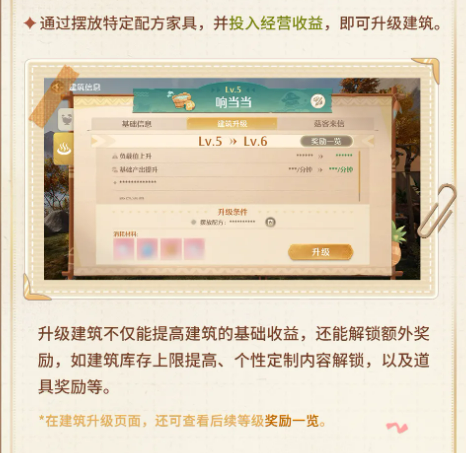 升级建筑也是很重要的一环。摆放特定配方家具并投入经营收益,就可以给建筑升级。升级之后基础收益会提高,还能解锁库存上限提升、个性定制内容、以及道具奖励等额外好处。在「个性定制」页面,可以给建筑改名,还能自由调整帐篷颜色、招牌样式和装饰样式,整体风格完全可以按自己的想法来搞。