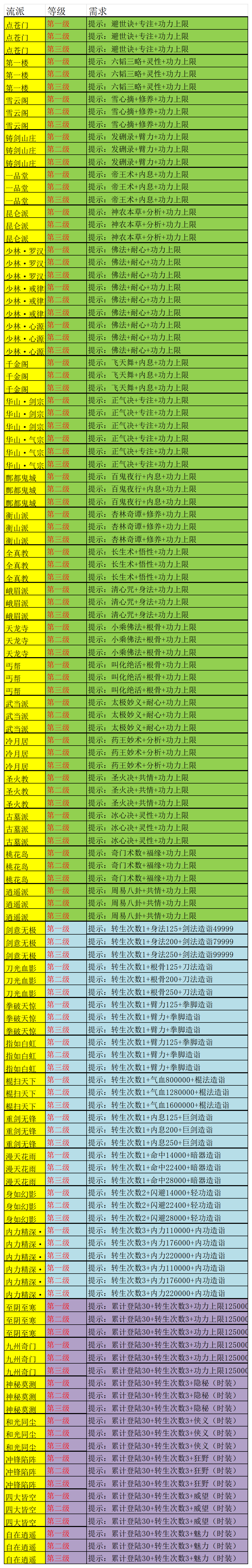 流派 等级 需求 点苍门 第一级 提示:避世诀+专注+功力上限 点苍门 第二级 提示:避世诀+专注+功力上限 点苍门 第三级 提示:避世诀+专注+功力上限 第一楼 第一级 提示:六韬三略+灵性+功力上限 第一楼 第二级 提示:六韬三略+灵性+功力上限 第一楼 第三级 提示:六韬三略+灵性+功力上限 雪云阁 第一级 提示:雪心摘+修养+功力上限 雪云阁 第二级 提示:雪心摘+修养+功力上限 雪云阁 第三级 提示:雪心摘+修养+功力上限 铸剑山庄 第一级 提示:发硎录+臂力+功力上限 铸剑山庄 第二级 提示:发硎录+臂力+功力上限 铸剑山庄 第三级 提示:发硎录+臂力+功力上限 一品堂 第一级 提示:帝王术+内息+功力上限 一品堂 第二级 提示:帝王术+内息+功力上限 一品堂 第三级 提示:帝王术+内息+功力上限 昆仑派 第一级 提示:神农本草+分析+功力上限 昆仑派 第二级 提示:神农木草+分析+功力上限 昆仑派 第三级 提示:神农本草+分析+功力上限