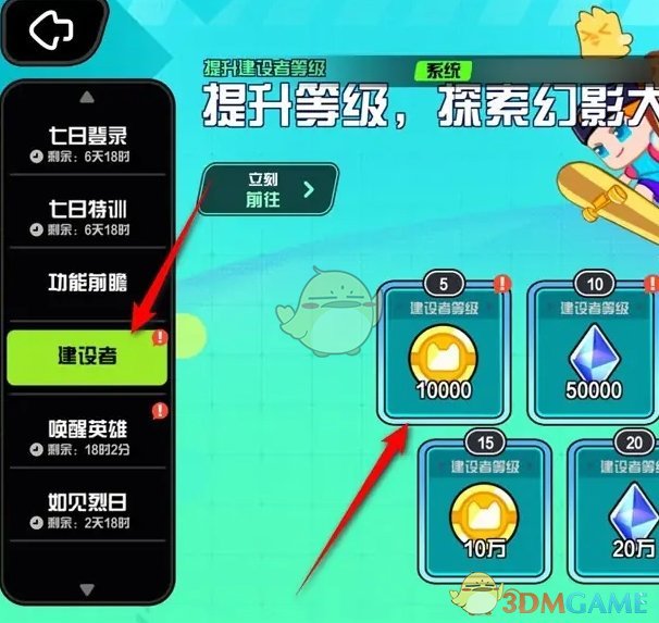 2、在活动中心,点击左侧栏目的建设者,前往建设者等级玩法页面;
