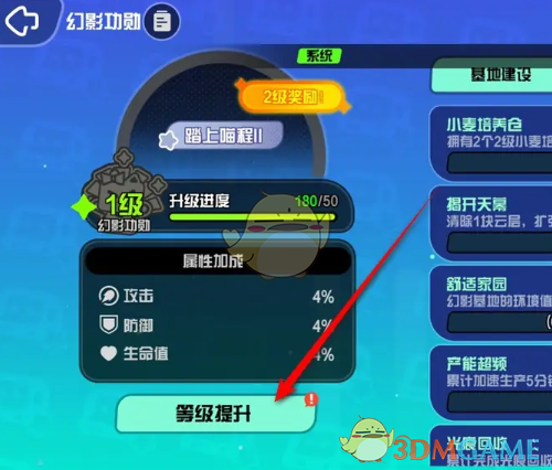 2、在幻影功勋界面的左侧即可看到等级提升的按钮,点击等级提升可提高属性加成。