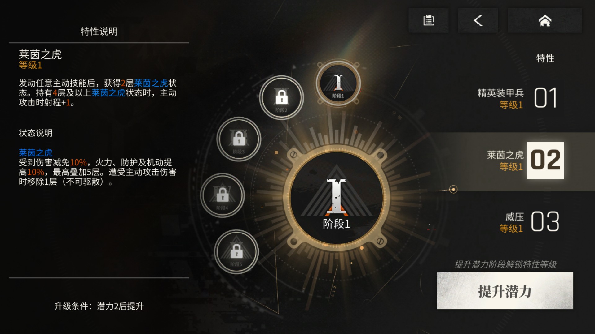 1、虎子姐的核心机制【莱茵之虎】,能为虎子姐叠加可观的免伤与输出能力,这对于重坦来说非常重要。基本上开【援护】+使用一次主动技能即可叠出4层,此时虎子姐将拥有40%的免伤,搭配【援护】提供的额外免伤,虎子姐无惧任何高压环境。