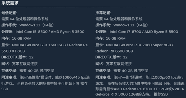 CPU:Intel Core i7-8700 或 AMD Ryzen 5 5500