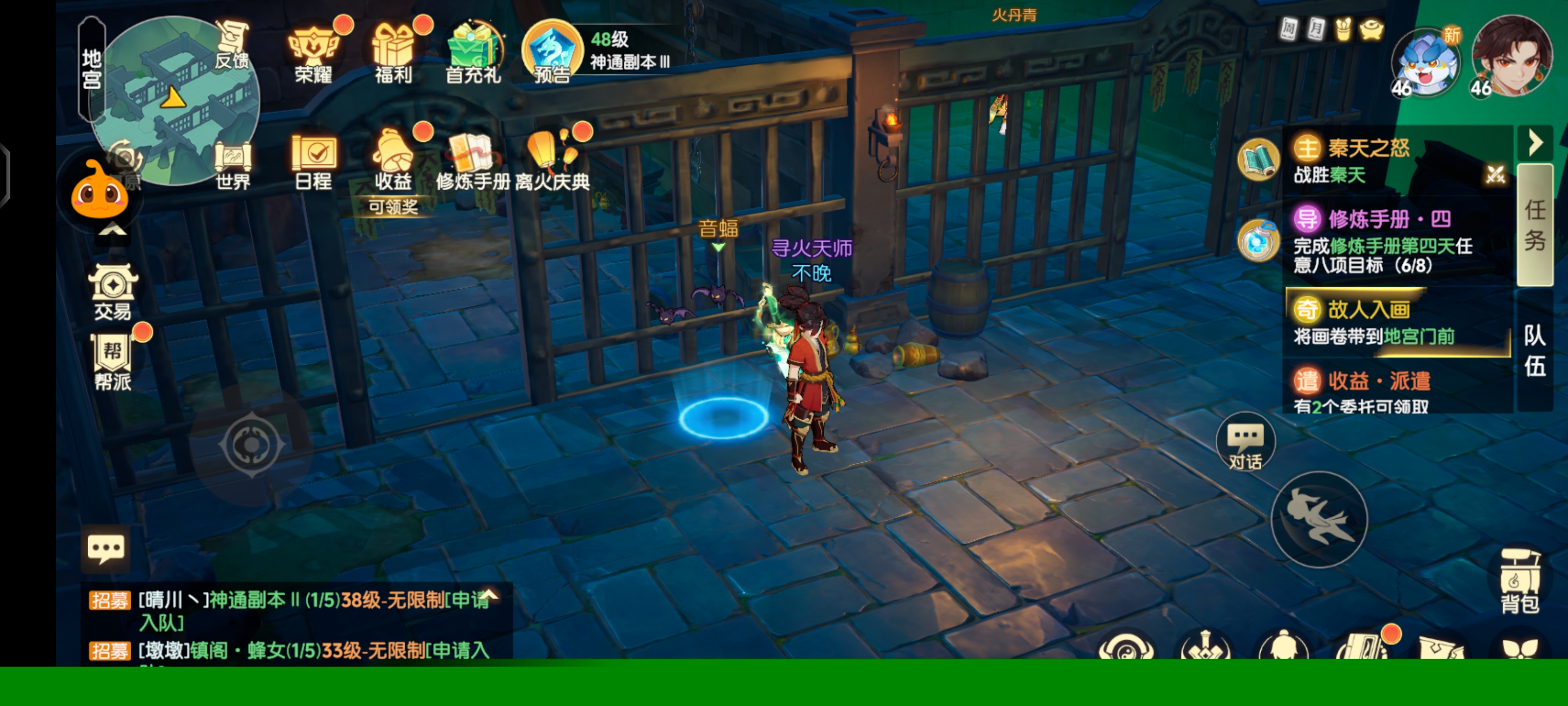 玩家需要来到地宫地图,点击音蝠可以触发故人入画奇遇任务,调查左上角石像可以触发石像奇遇任务。