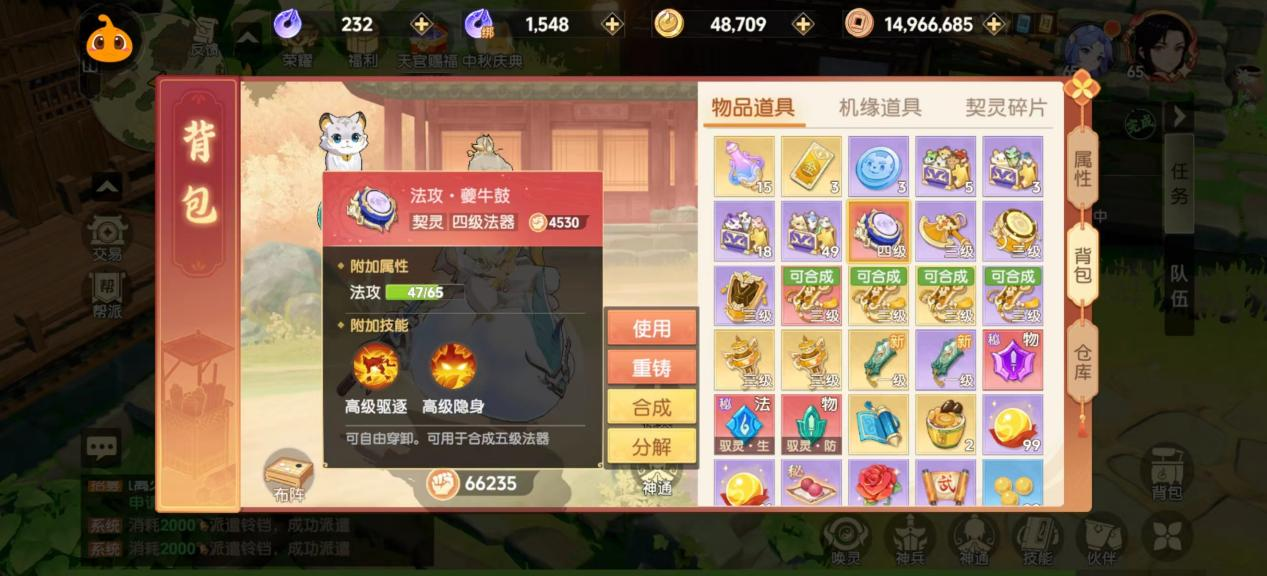有的小伙伴会打出一些法器,技能看似不适合目前的契灵,例如高级识破+高级隐身,高级追击+高级驱逐。实际上这些都是十分有用的法器,洗出来以后即使目前用不上,但一定要放在背包,换一个法器洗双高技能也行。