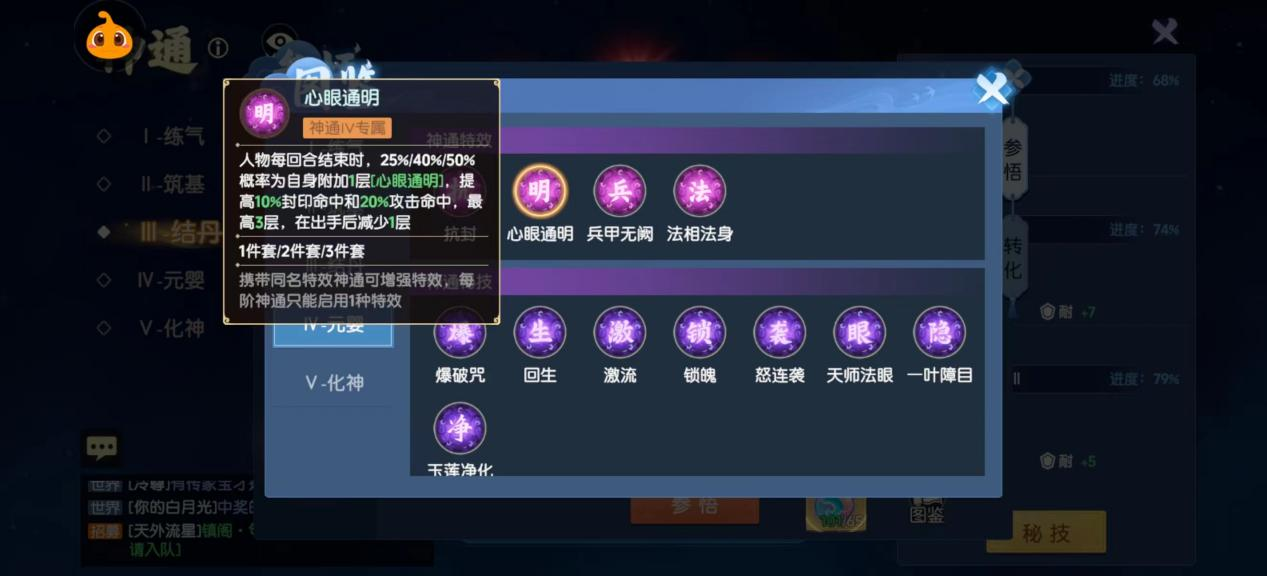 元婴期神通:4个特效,分别为抗封、心眼通明、兵甲无缺、法相法身。小编推荐心眼通明>抗封。作为封印,提高封印概率简直是神技,一定要洗,该特效只有在元婴期会出,抗封也行,但有点鸡肋。