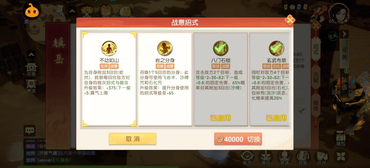 基础的5个技能不详细介绍了。小编简单讲讲作用,分别为群秒、单封招式、全封、破敌方防和自身减伤。能力非常全面。随着等级的提升,战意招式也会解锁,技能效果分别为单封两个(三回合)、召唤分身、全封四个(一回合)、自身加免伤、提速单封。
