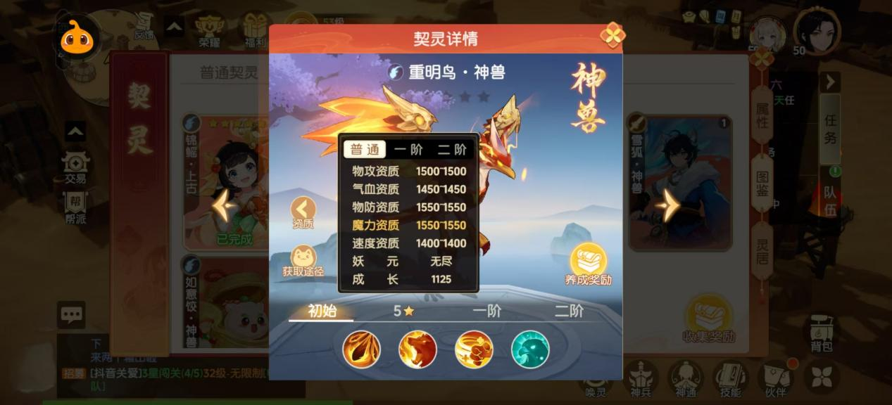 资质篇:重明鸟的气血资质为1450,是5神兽中最低的,物防资质为5只神兽中最高的。速度资质仅次于如意饺,可以考虑耐法加点,4魔1耐,或者3.5魔1.5耐,5魔加强结合重明鸟的低速度,站场能力一般,高防御的重明鸟配合吸取可以有不错的生存能力。