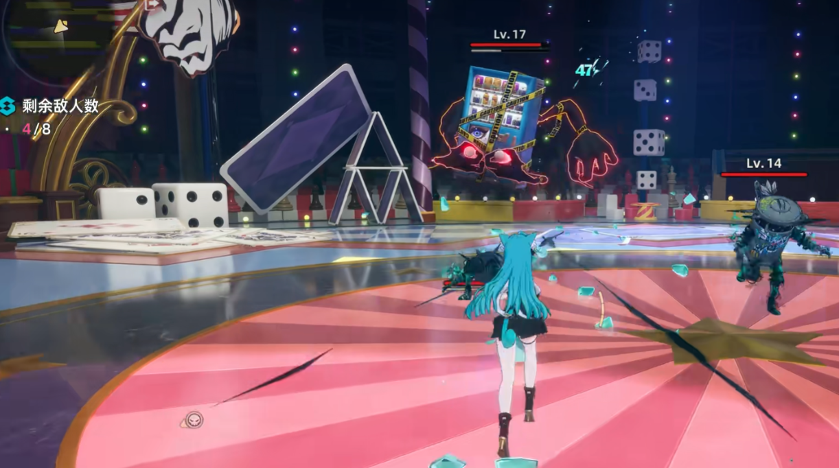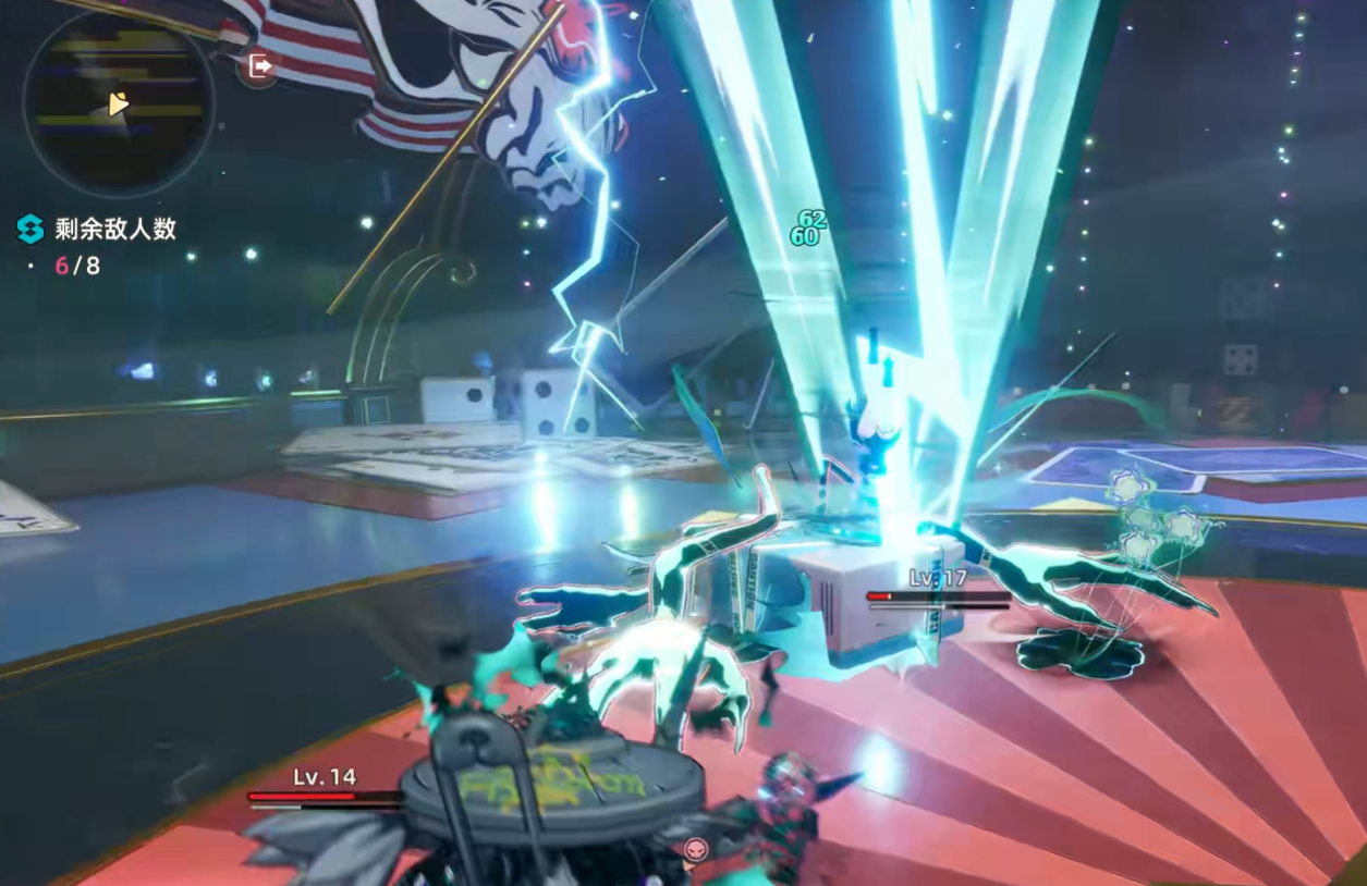 你进去之后就可以直接前往中间的舞台,这时候会直接出现一波8个怪物的场景。他就要求我们击败所有的敌人,这些敌人都是由垃圾桶和灵魂组成的怪物。所以应该比较畏惧电属性的攻击,并且自身的防御力也强,我们可以将他们拉到一起。