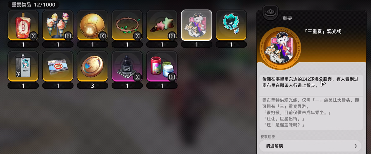 当你获得了【三重奏观光线】道具后,不要急于使用它。根据道具描述,它的使用条件是:只有未成年角色才能乘坐三头犬。此时,你可能会发现尽管已经获得了道具,但仍然无法直接进行骑乘。实际上,游戏给出了另一个线索:奥布里会出现在湛望角东侧的Z42环海公路旁。前往该区域并与奥布里互动时,你会被提示只有小孩可以乘坐。