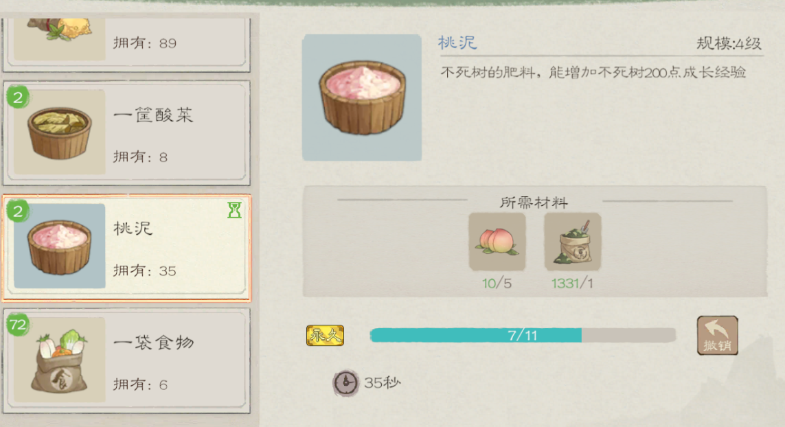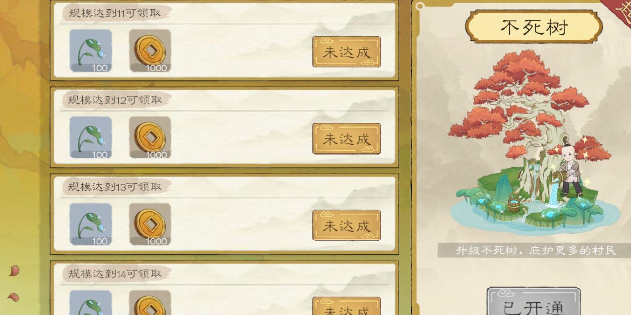 不死树:图一,游戏时间每天都可以给不死树吃8个肥料,前期桃树桃子少,制作的桃泥,吃都不够吃,再加上前期是最需要不死树人口上限的时候,所以不死树基金性价比就凸显出来了,前期过渡更加舒适,桃树在夏秋采摘桃树会掉落,把握好时间采集。