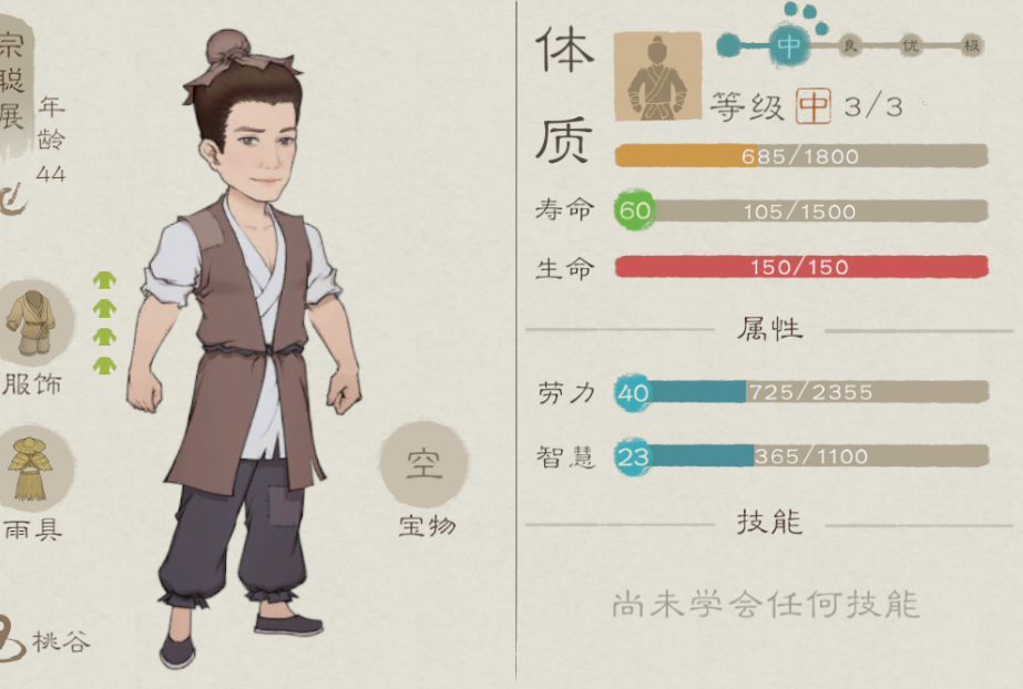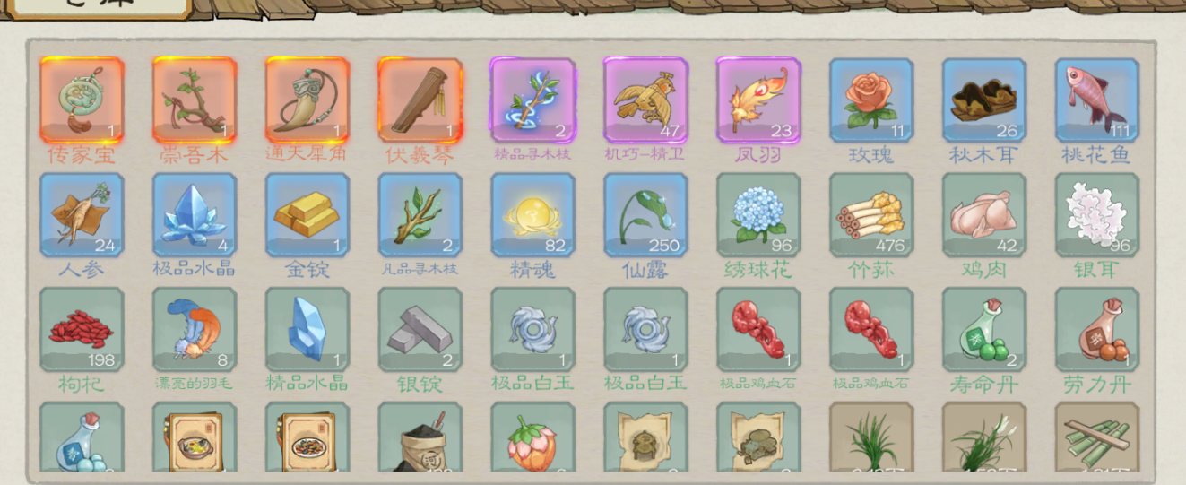 宝物的使用:现实时间,每天把伏羲琴给年轻的带有技能的男村民带上,崇吾木给年轻的女居民带上,等他俩生了娃,一次就新增两个带技能的村民了,带技能的村民用起来确实好一些,聊胜于无。