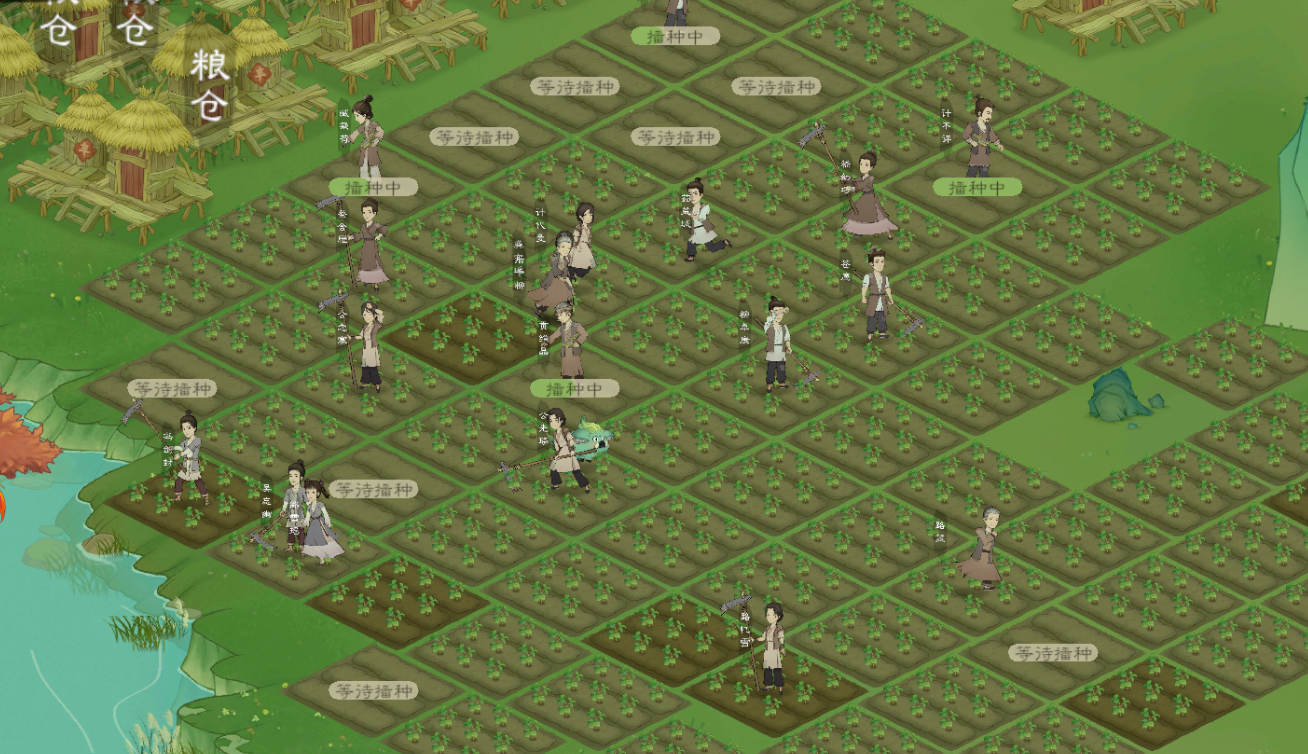 前期可以多建农田,最好20以上,农田不会掉耐久,庄家放地里也不会消失,无须担心没有居民耕地,只需要集体临时去一趟,半分钟不到,大家一起把种子播下去,就可以离开去做别的了,记得一键大量播种,这个时候会弹出来一口气选一堆居民的界面,然后看看自己几块田地,除以四等于多少,就选多少居民来播种,至于施肥,累充送的当康可以自动施肥,如果没有也没事,随手一划,一键施肥,贼方便。粮仓放不下?可以多建造几个。