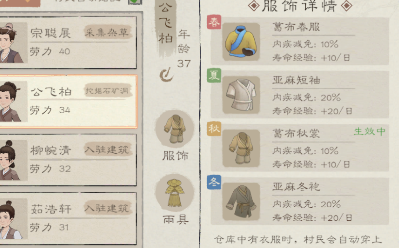 衣食住行:记得给每个村民准备一套四季衣服和雨具,以及好的住所,这样健康下降慢,吃的药就少了,吃的药少了,活的就久了,活的久了,压榨的价值就多了,活的太短,刚把劳动力养起来就嘎了,刚把技能书学了就嘎了,岂不血亏?所以不要在衣食住行上卡脖子。