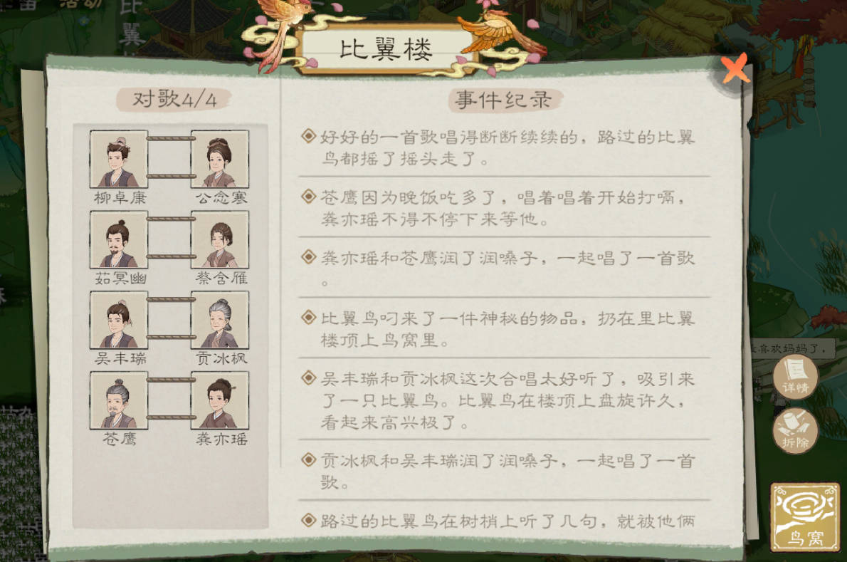 关于比翼楼:如图二所示,游戏里的每一天夜晚比翼楼里的村民都会去掏鸟蛋获取各式各样的游戏道具放在鸟窝,等你去领取,所以对歌列表记得塞满村民,偶尔有死亡的村民记得及时补充进对歌列表当中。