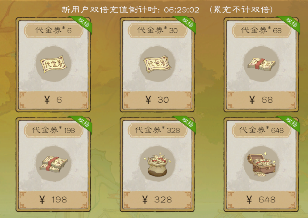 关于氪金:如图三所示,游戏良心到什么程度呢?可以看做68元买断,进入游戏后因为新玩家有48小时充值双倍代金券,所以仅需68元,便可将最重要的永久月卡以及孟和基金拿到手。此时就可以畅快爽玩了,肝到爽!68以外的付费内容看玩家个人情况,没有逼氪内容,不存在不买68以外的就玩不下去或者玩的很痛苦,68有了之后,全程玩的很舒服。切记,仅有48小时双倍代金券,错过再无。