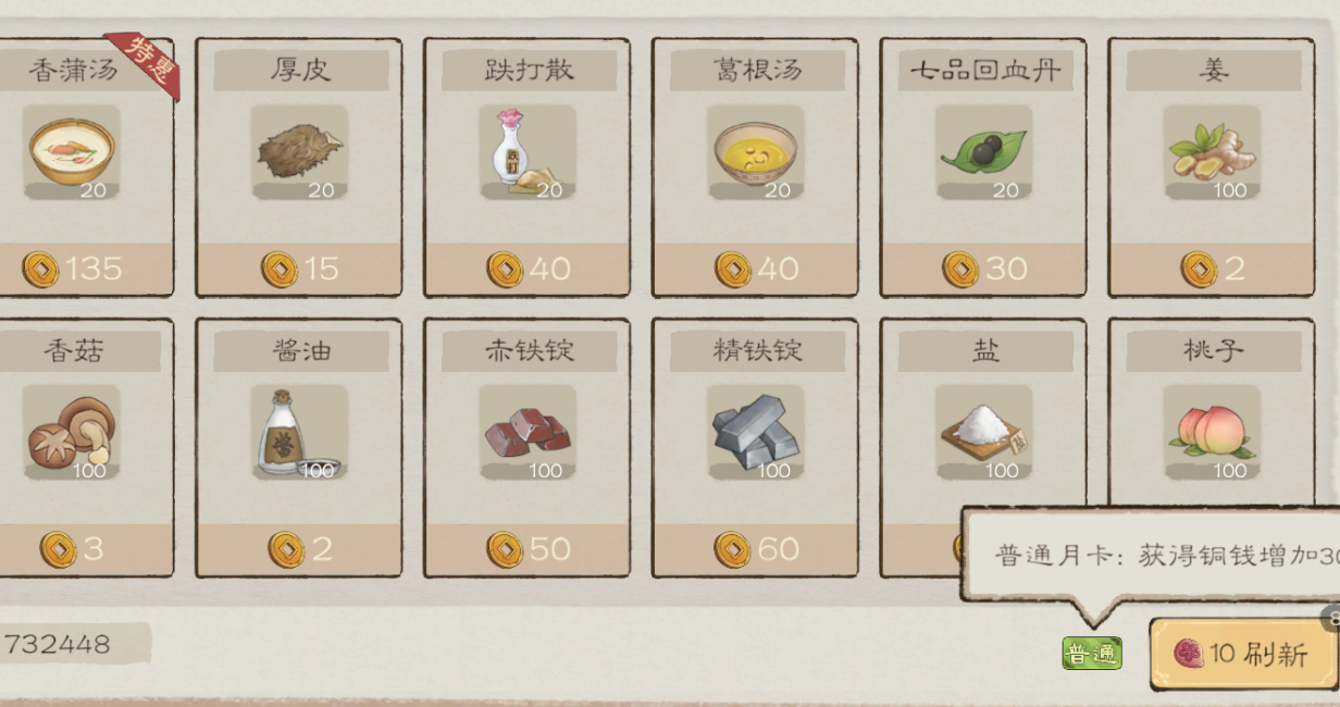 桃谷货郎每天要买铁锭,库存维持在五百左右即可,以及大量的种子,每种类型的种子库存维持在一万左右即可。新手进游戏第一天要买葛根汤应急,第二天看自己,比如我第二天已经自给自足了,所以不买了。