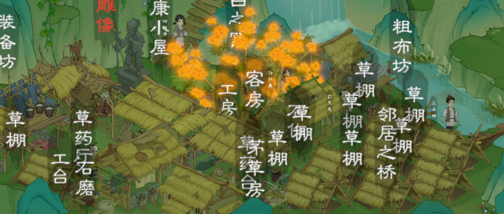 渔溪村地图:每天找村长做完三个声望任务,每天在伐木场采集樟木,每天在采沙场采集沙子,这些不要忘,很重要。这里的杂货店可以买一些前期发育必需品,比如铁锭,种子之类的,可以看出某种意义上的桃源货郎,应急用。