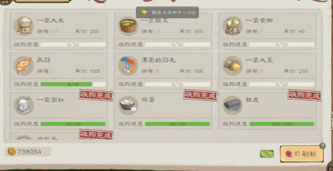 铜币来源:如图一图二所示,图一为一次性,游戏内每一天都可以领取一部分用来前期发育消耗。图二为桃谷货郎收购内容,收购齐全后,点免费刷新,又可以下一轮收购。收购内容大多为杂物,也就是材料-杂物选项里面的,大多都要用到采集和种植,所以农田需要开辟很多,我为了图方便,开了80农田,等白天会录屏语音讲解一个技巧,如何在前期方便管理这么多农田的同时,不影响其他内容,到时候发,记得来看。