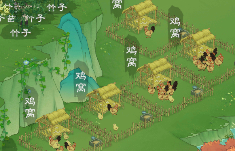 关于鸡窝:可以建造五个鸡窝,鸡苗来源于森林地图-猎人小窝以及鸡蛋孵化,孵化鸡蛋需要当前鸡窝有成年鸡,所以不要一口气把成年不下蛋的鸡都变成鸡肉谢谢,每个鸡窝至少留一个成年鸡孵化鸡蛋,鸡蛋只可以在春夏两季孵化,鸡饲料是杂草,五个养鸡场,合计100个养鸡位置,全肝满情况下对杂草需求量挺大,所以不要忘了平时多采集杂草。