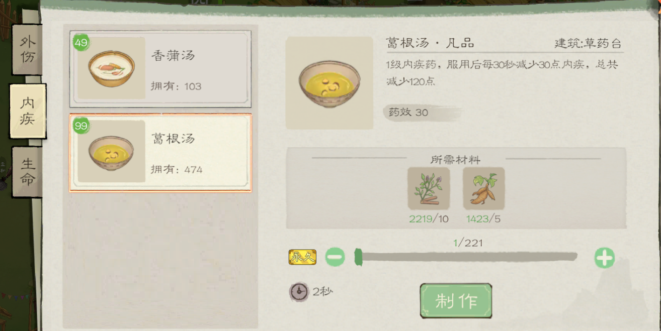 吃药的时候会显示红条,红条越长,病的越重,劳动力越底,红条满了也别怕,村民不会死的,只会老死和被兽潮打死,只不过在前期,尤其是第一天,劳动力太低了,效率太低,效率低了干啥都完蛋,所以上文才说要多买葛根汤熬过第一天,第二天开始可以大量制作葛根汤了,就可以不买了,所以别忘了把能采集的需要大量用的资源采集完,别制作的时候发现不够用,早干嘛去了。