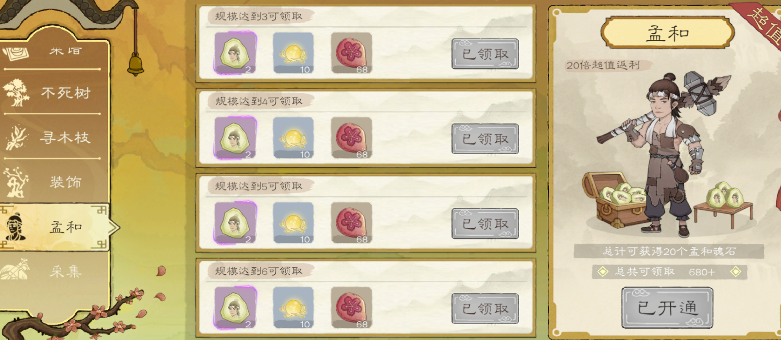 有了永久月卡,肝起来爽很多,永久月卡可以看做游戏门槛,超级值,玩的越久领的越多。孟河基金可以让你在前期一个孟河就可以抵挡一切兽潮,不用担心打不过了。