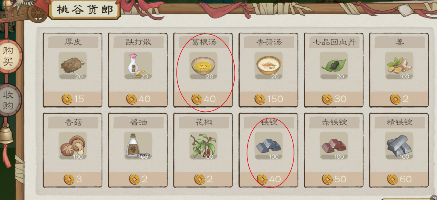 每隔几天村门口会来一位桃谷货郎,游戏第一天记得买空葛根汤,铁锭数量保持在五百即可,每次来都可以刷新三次,每次都买葛根汤,至于种子,够用即可,这个看自己,建议每个种子都囤几千个,用起来也挺快的。