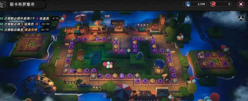 进入集市之后,玩家会看到一个很大的棋盘界面,上面密密麻麻分布着各种格子。抽卡的方式不是直接点击十连或者单抽,而是通过投骰子来决定前进的步数,投出几点就往前走几格,走到哪个格子就能拿到那个格子上的奖励。这种玩法有点像小时候玩的飞行棋,但是奖励可比飞行棋丰富多了,角色、武器,各种材料都有可能获得。