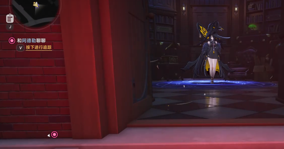 到了地方之后,会看到一栋红色的小房子,这个房子挺有特色的,一眼就能认出来。走到房子跟前,对着门敲一下,就会触发一段过场动画,画面里会先闪过一顶黑色的帽子,然后一个穿着魔女风格服装的人物就出现了,她就是魔女之家的主人黑羽。