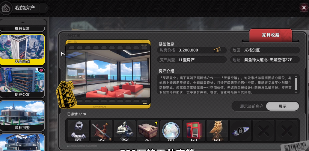游戏里玩家可以购买大量房产,每个房产都会有对应的异象家具,完成特定任务之后,玩家就可以顺利获得物品,每个物品都会有独特的作用,平时也可以作为摆一件装饰房间,每个房产都会绑定特定的异象家具,玩家如果想获得何人的头盔,需要购买伊登公寓,具体的购房价格和地区,会在购买的时候详细展现出来,玩家把地图缩小之后,能直接点击跳转到公寓,购买公寓之后,玩家可以直接查看到页面上所有等待激活的异象家具。