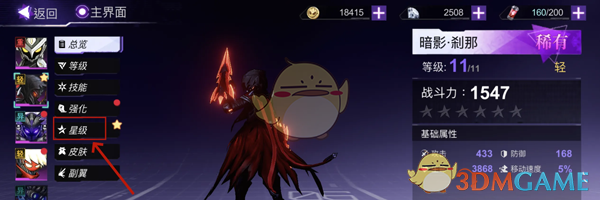 2、然后选择暗影刹那角色,点击左侧的星级;