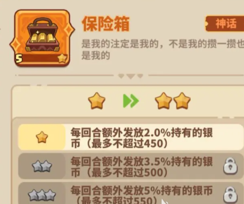 看似保险箱对于角色战斗力的提升没有太大的帮助作用,但其实在游戏里想要让更多的英雄上场,就需要消耗银币去召唤,可以借助保险箱让角色有更多的银币,这样才能让一些强力的英雄加入到对战过程中,玩家可以根据保险箱的这个特性让自己不断积累更多的银币,从而在下一回合中能获得相应百分比的银币数量加成。