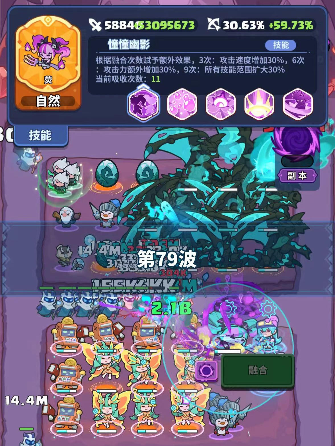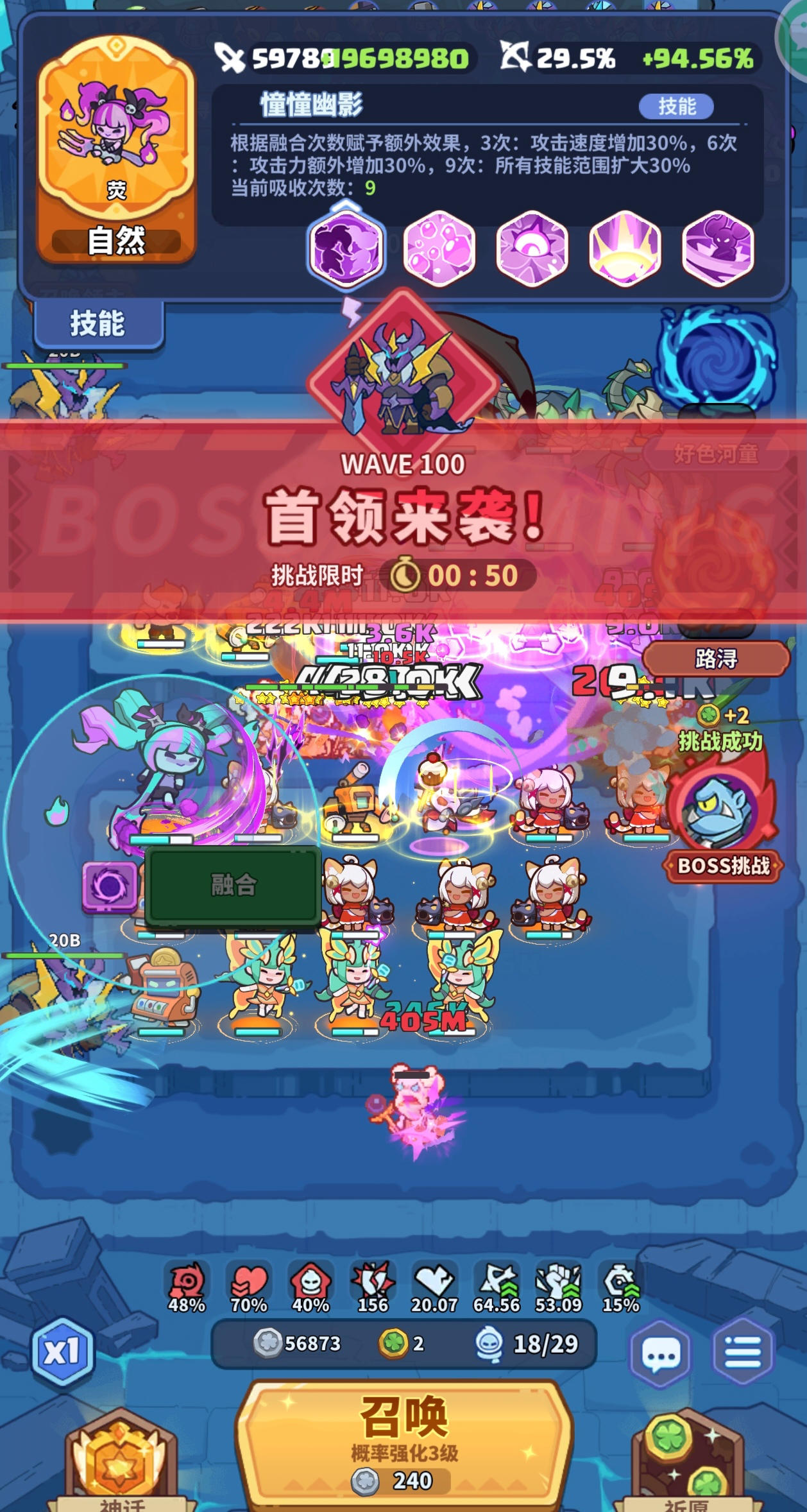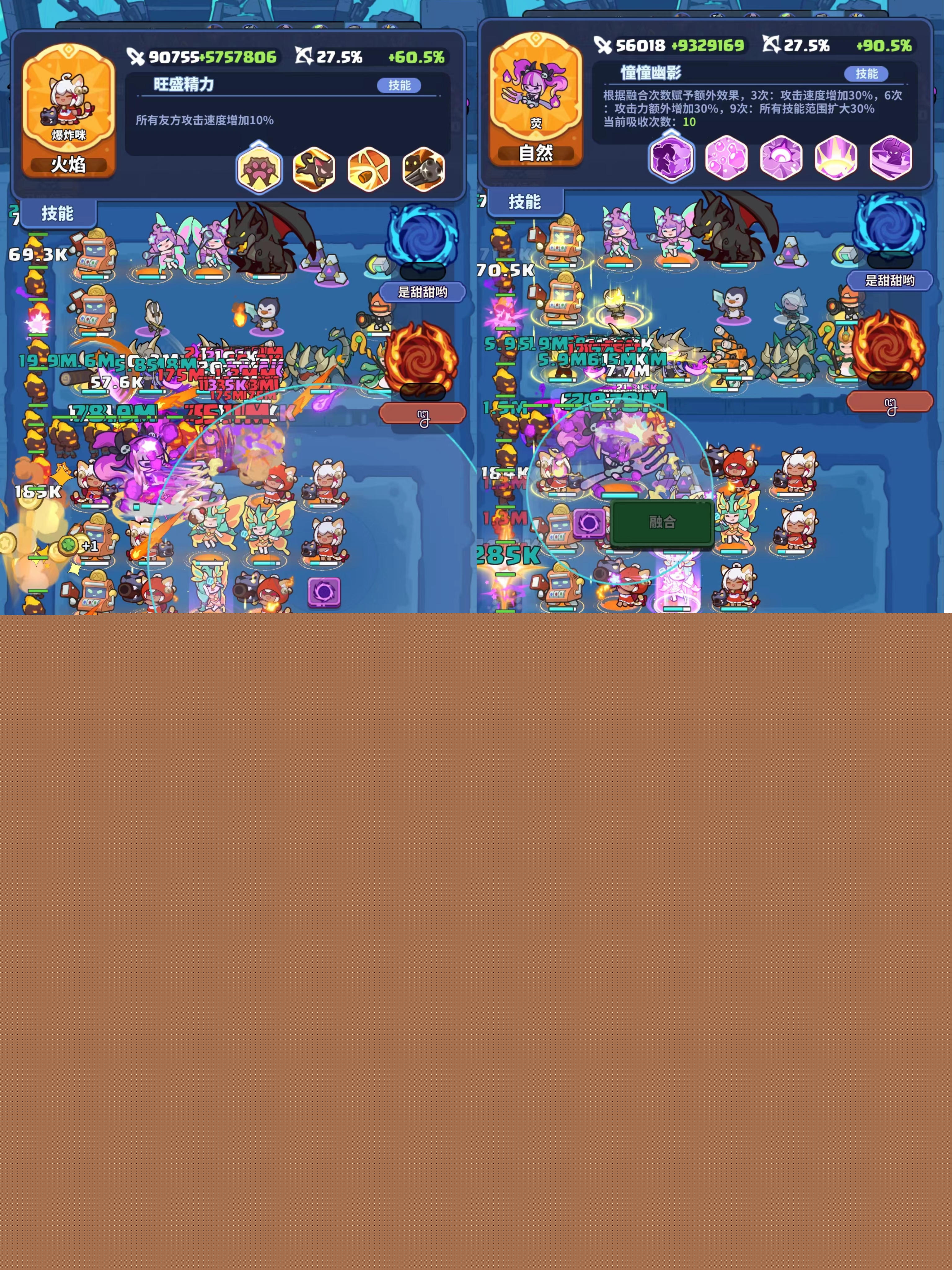 实测中融合荧比较看运气,快的话40+关即可融合10莹,慢的时候70关才融合完毕。