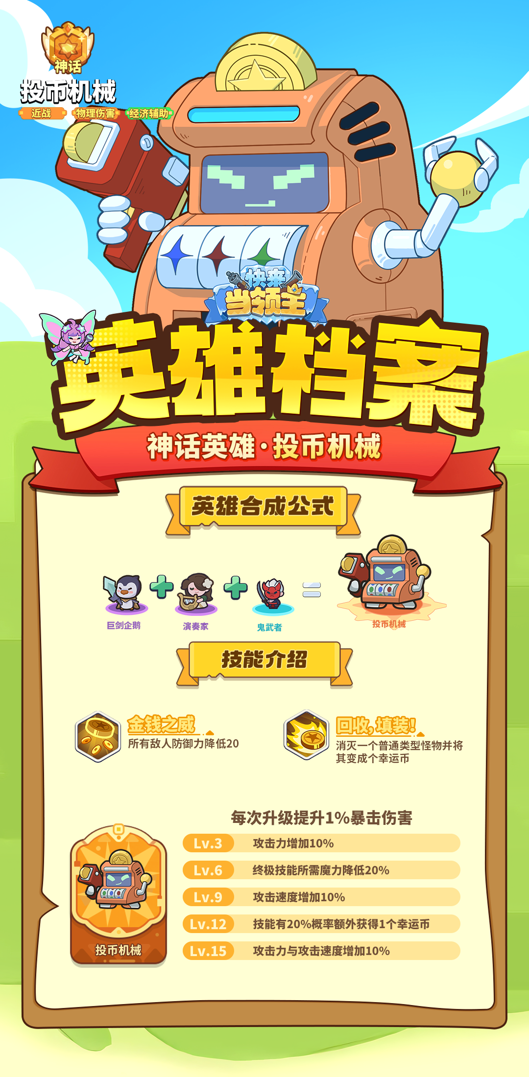 快来当领主投币机械怎么合成?比斯大陆的机械族神话英雄『投币机械』,投币机械身上凝聚了人类顶级科技,拥有能将敌人转为幸运币的神奇能力,是辅助领主大人,东山再起的好帮手!下面给大家带来了《快来当领主》投币机械合成公式分享,一起来看看吧!