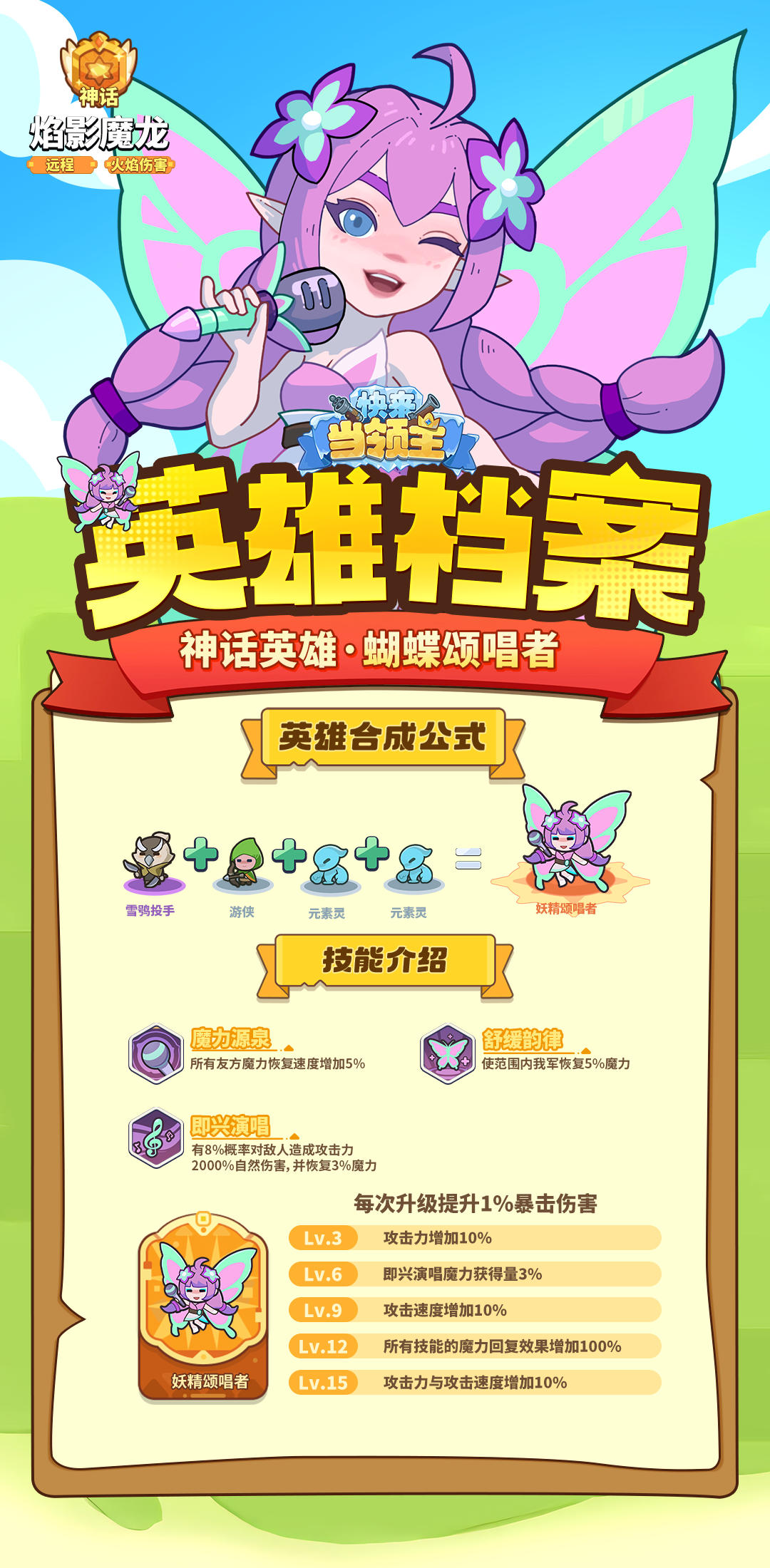 比斯大陆的精灵族神话英雄『妖精颂唱者』,掌管比斯大陆绝妙声乐的颂唱者,歌声美妙如海妖的吟唱,以她带有魔力的歌声迷惑敌人,赋予英雄更强的战斗能力,是比斯大陆上的强力辅助英雄!下面给大家带来了《快来当领主》妖精颂唱者合成公式分享!
