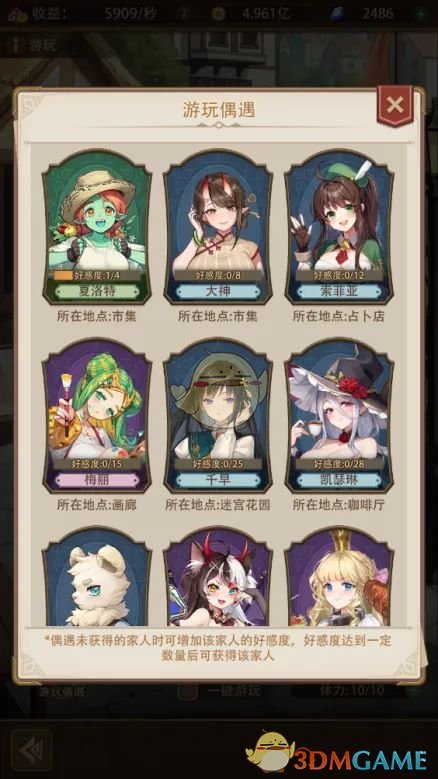 【收益】随机偶遇家人,获得好感度及随机游戏道具,未拥有的家人好感度到达后可以领回家,20点声望/次