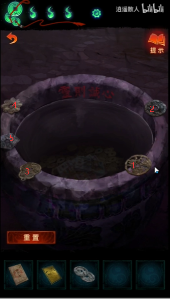 1、首先点击中间水潭,把五枚花钱放上去,按照下图顺序丢入即可获得金卡