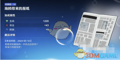 游戏主界面偶尔会有飞来的海鸥,并散发着光芒,点击后即可获得特殊的藏品-海鸥带来的报纸。