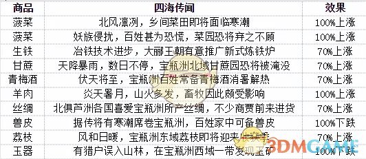 四海逸闻中的信息,会影响两日之后,所提及商品的价格。一部分传闻会暗示商品价格上涨,另一部分传闻会暗示商品价格下降。其中的信息有真有假,我们不要全部相信哦,要根据自己的“经营”经验,做出判断!
