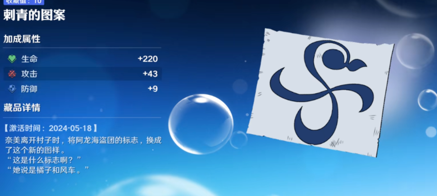 看到娜美的刺青就感慨万千,娜美在用小刀刺自己胳膊时的动画每次看都忍不住想流泪,不得不说,魔方选藏品有东西的。获得方式:可爱小鸭号升级至30级
